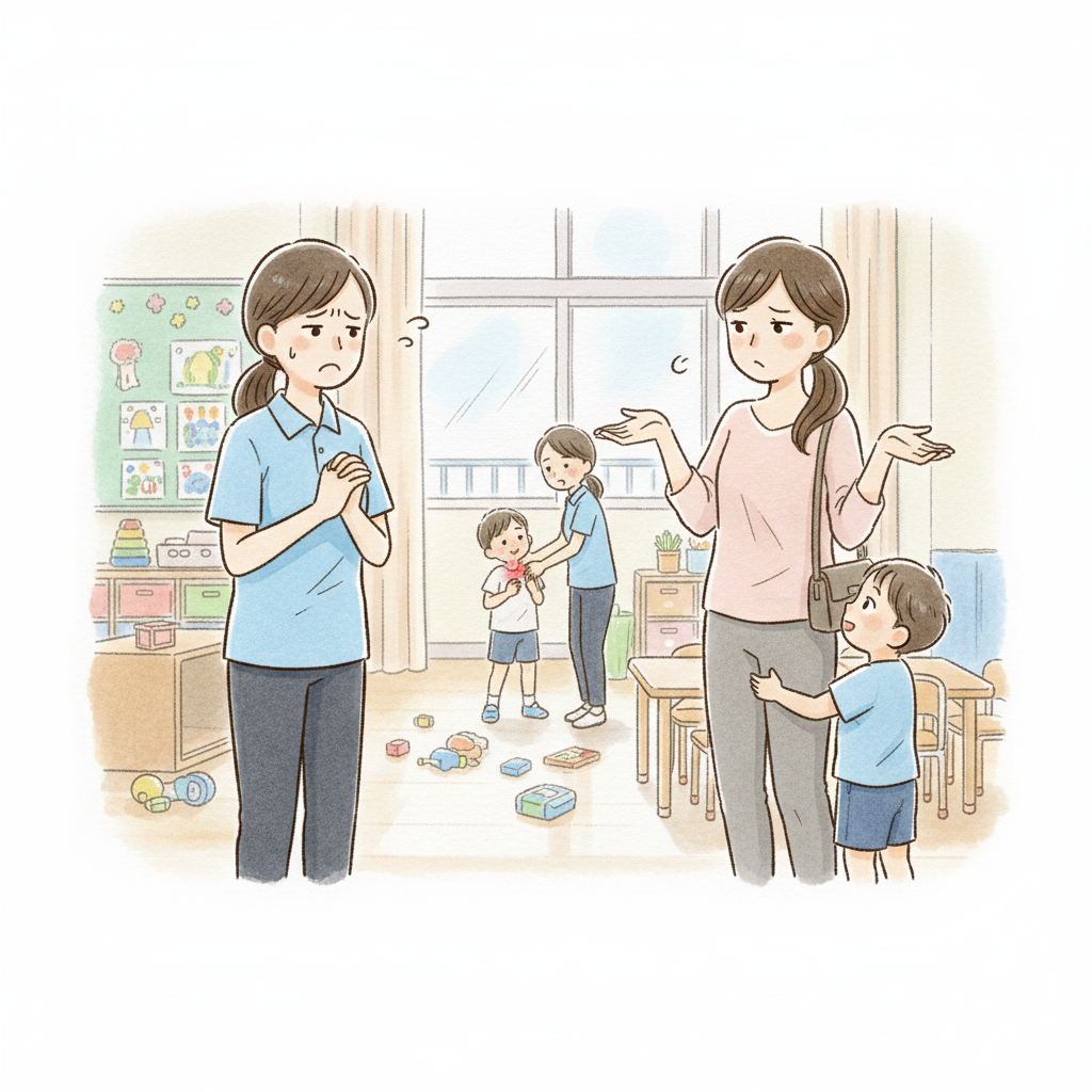 他の保護者もいる中、感情コントロールができず興奮していたため、園長と主任で事務所に入れ落ち着くように促し、HさんはTくんの父に連絡しました。