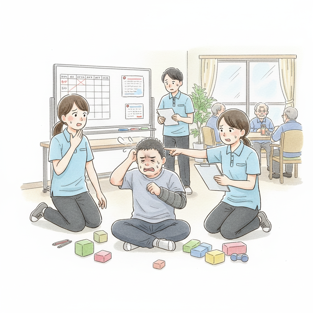 支援員側に事前共有が不十分だったため、彼のこだわりや不安感が許容量を越え、そのストレスが自傷行為として爆発してしまったのでしょう。
